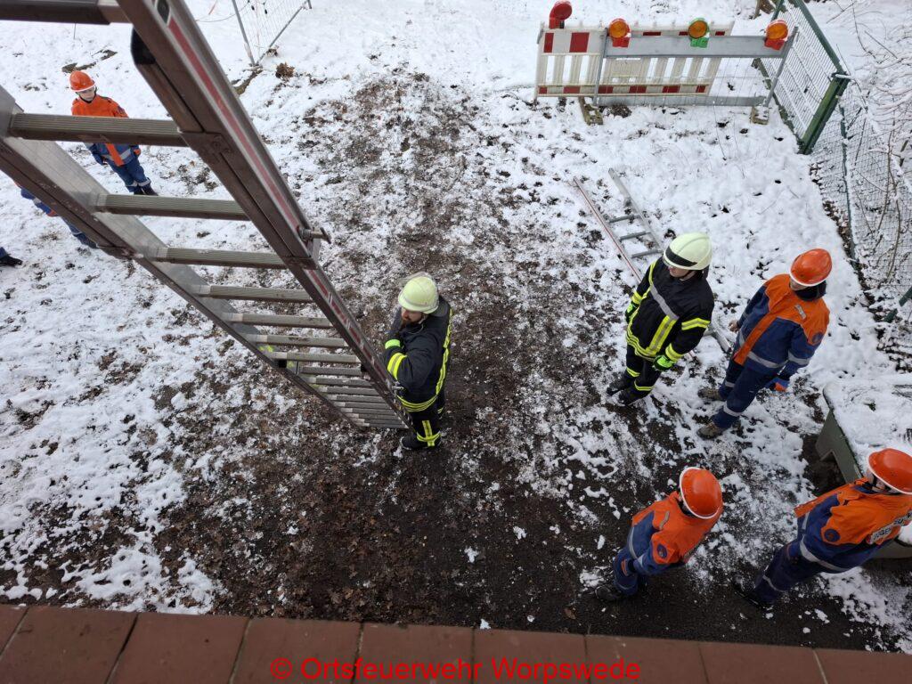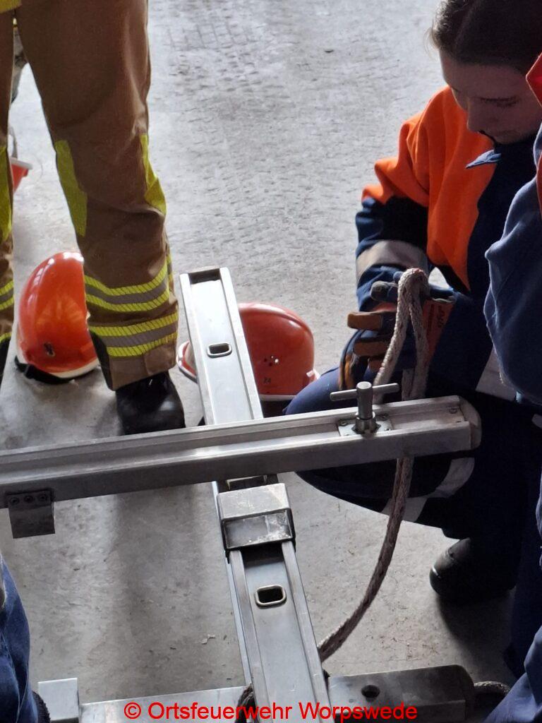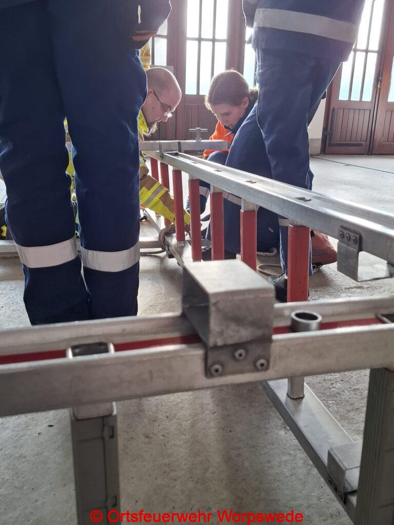 Im Mittelpunkt stand die Steckleiter: korrektes Tragen, sicheres Entnehmen vom Fahrzeug und das saubere Arbeiten im Team. Schnell wurde klar, dass diese Abläufe mehr Koordination erfordern, als man zunächst denkt – doch mit klaren Kommandos und guter Zusammenarbeit klappte es immer besser.
